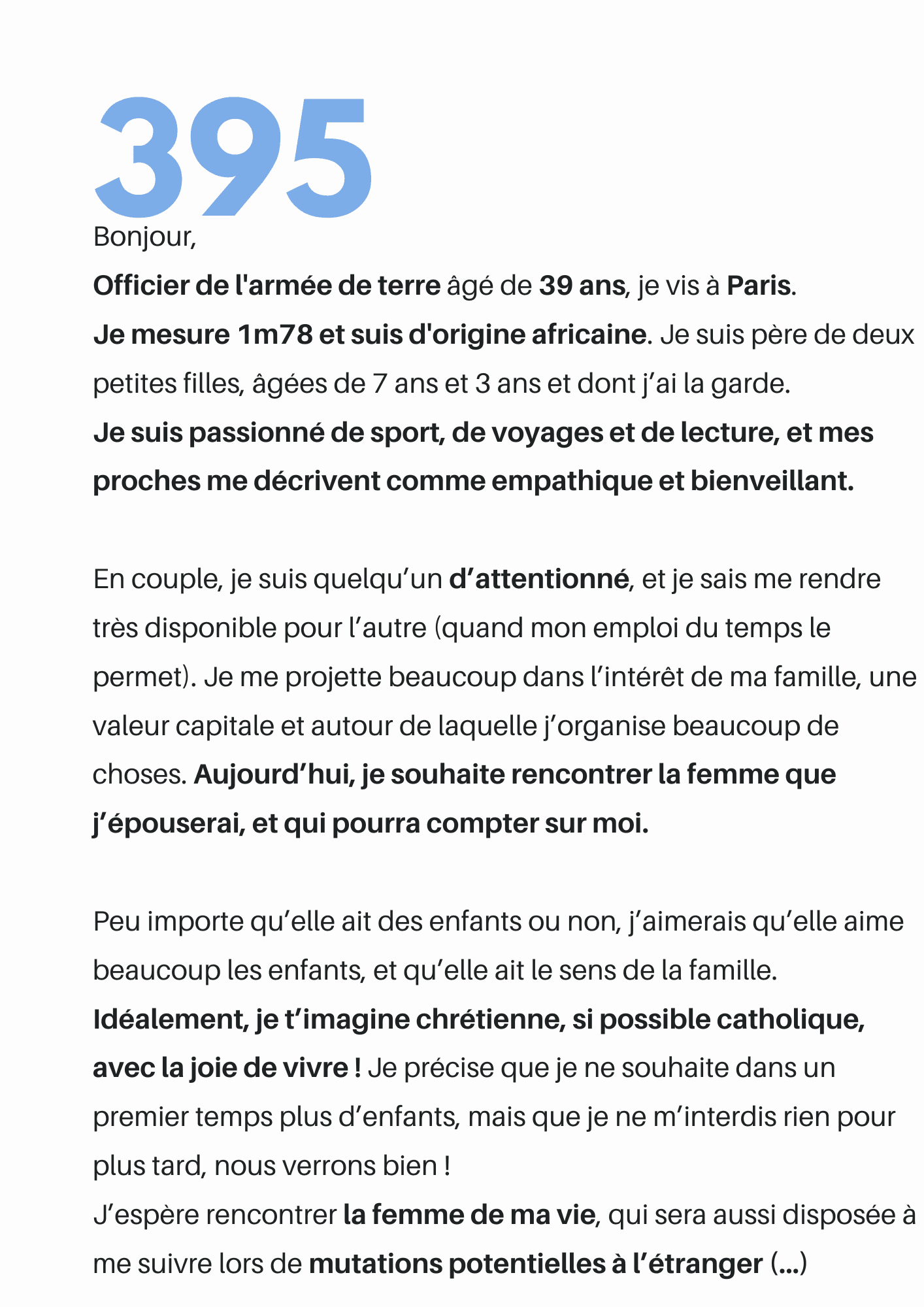 Les candidates qui vous écriront sont à la recherche avant tout d'un homme de valeur pour bâtir une relation sérieuse et leur avenir.
