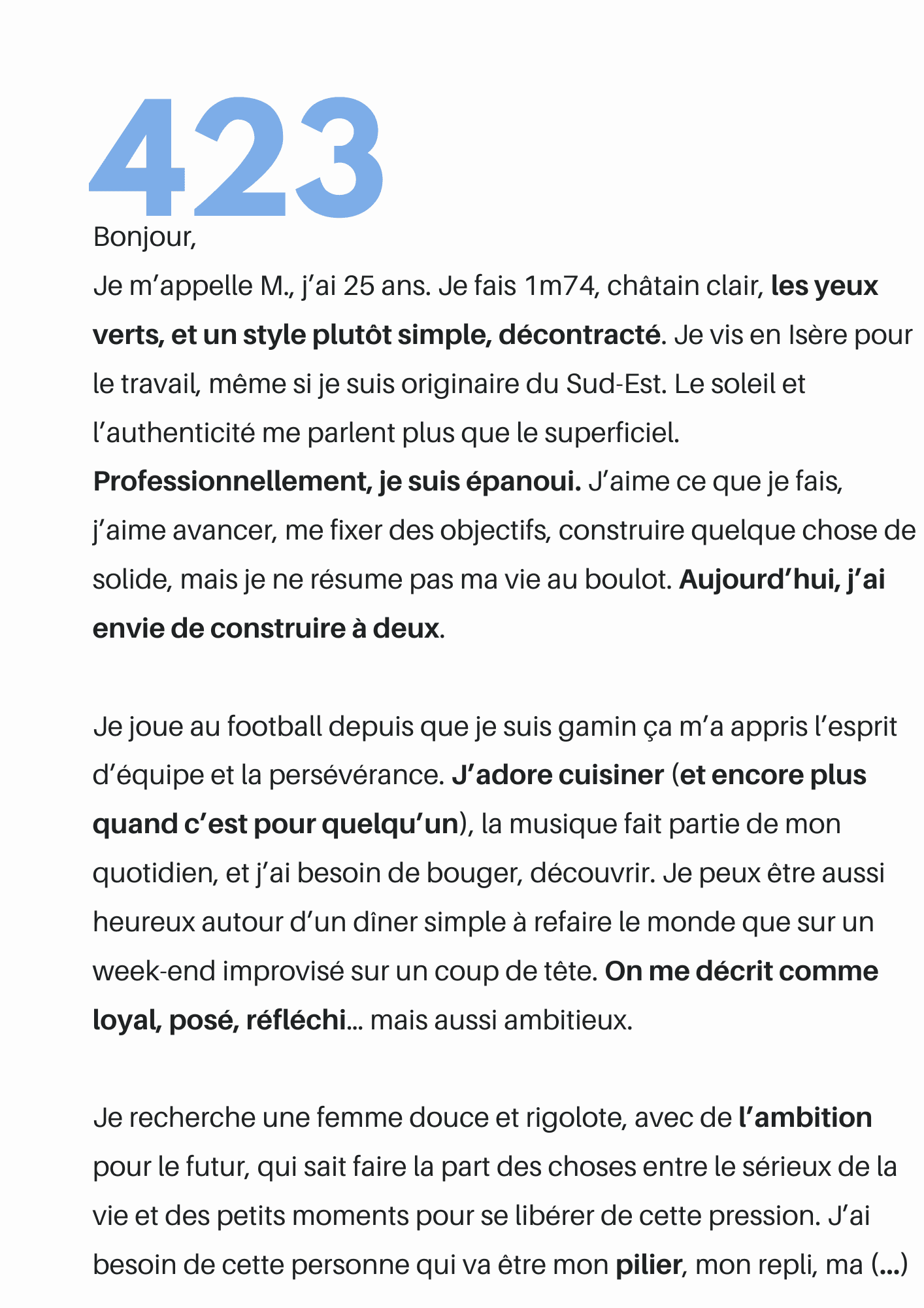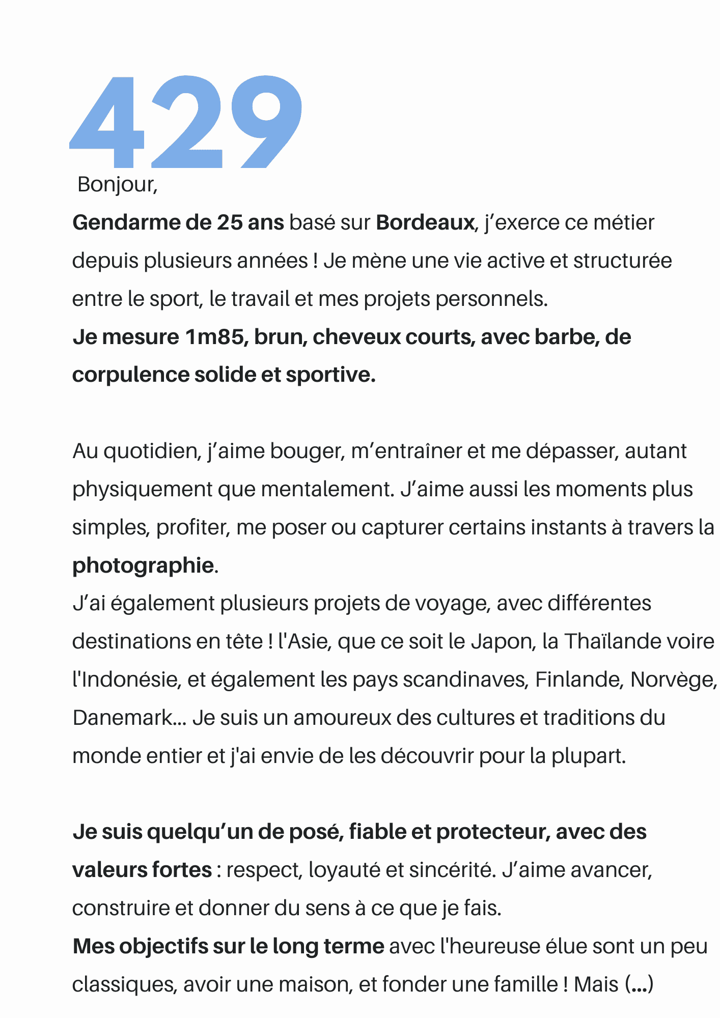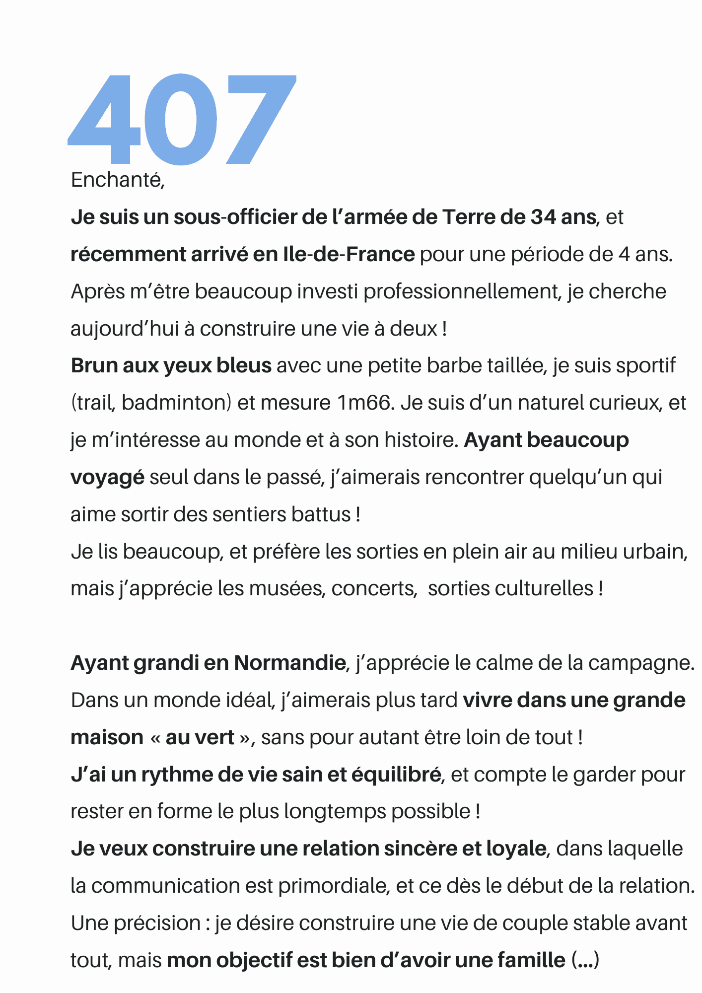 Le profil recevra directement votre présentation. Il n'y a pas de bonne ou de mauvaise façon de parler de soi. Chaque femme est différente, chaque homme l'est aussi. À vous de faire en sorte d'être celle qui choisira, sachant que le profil n'est pas obligé de vous répondre.