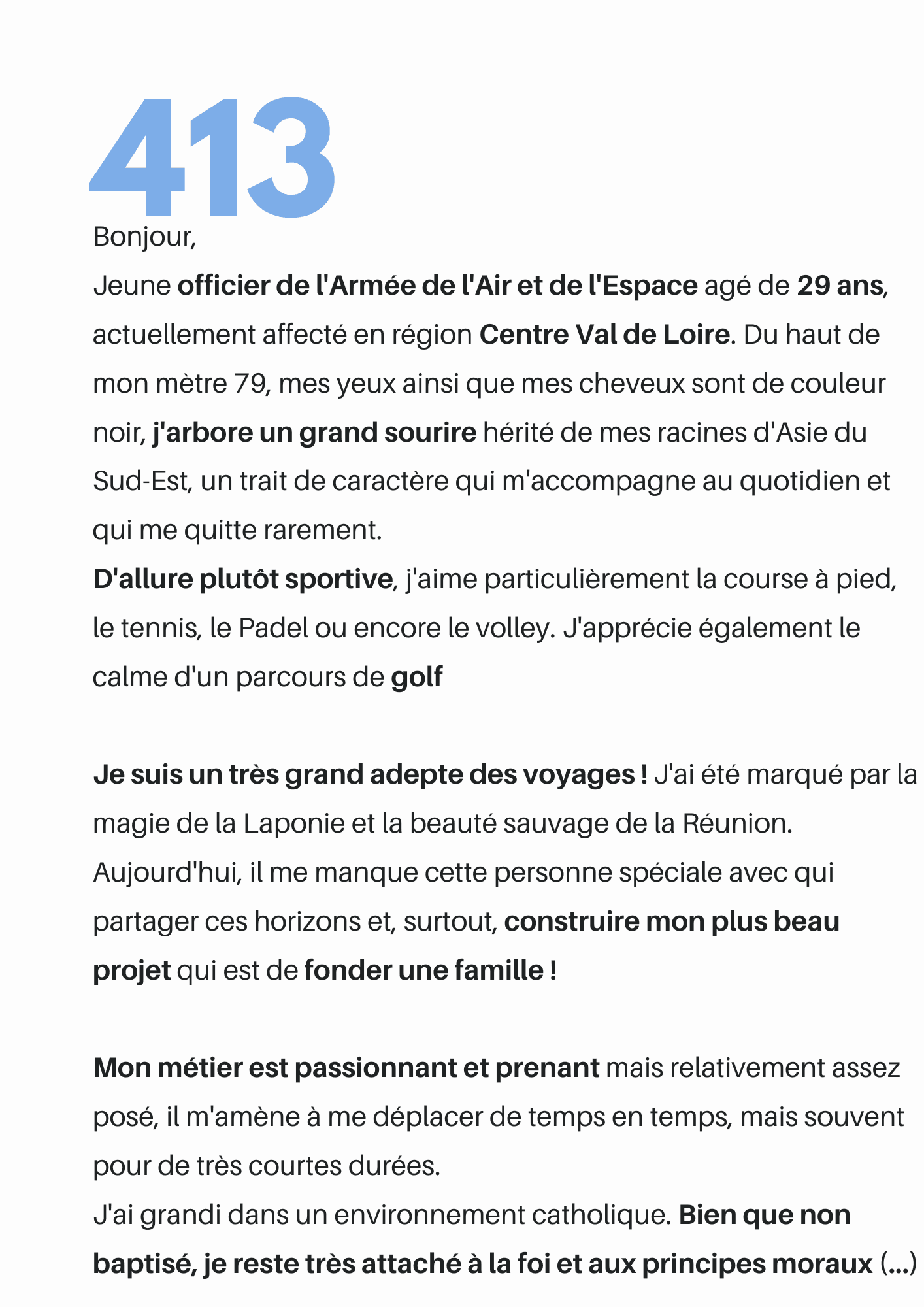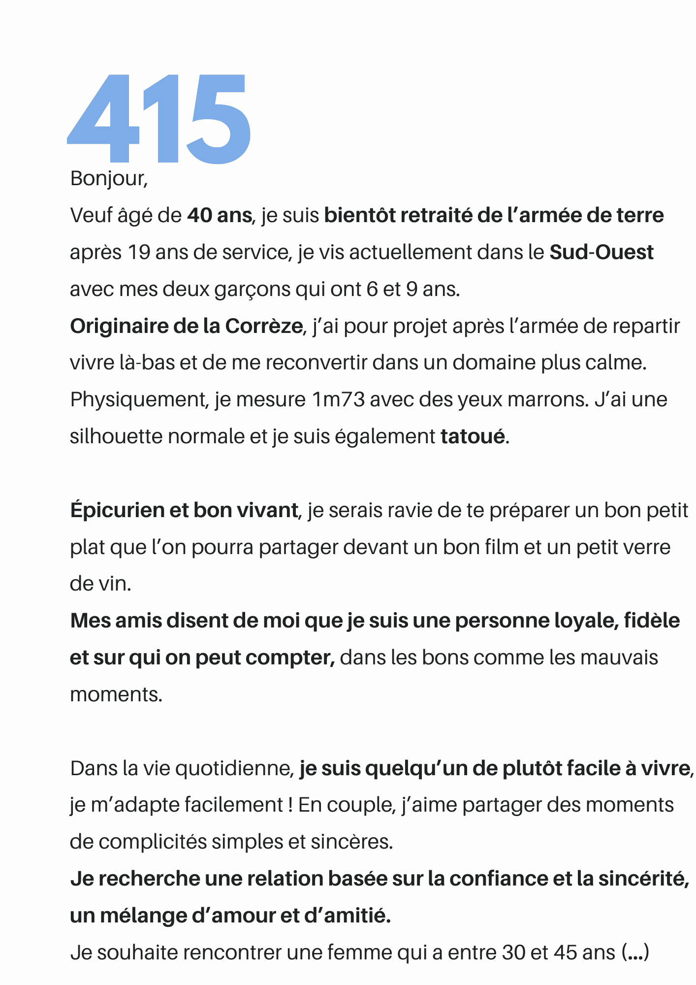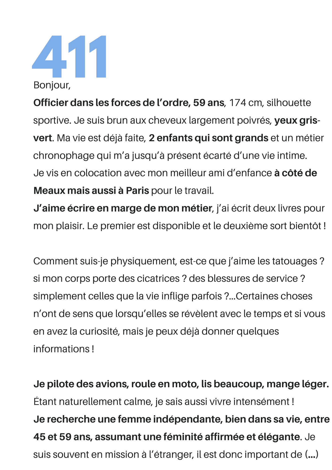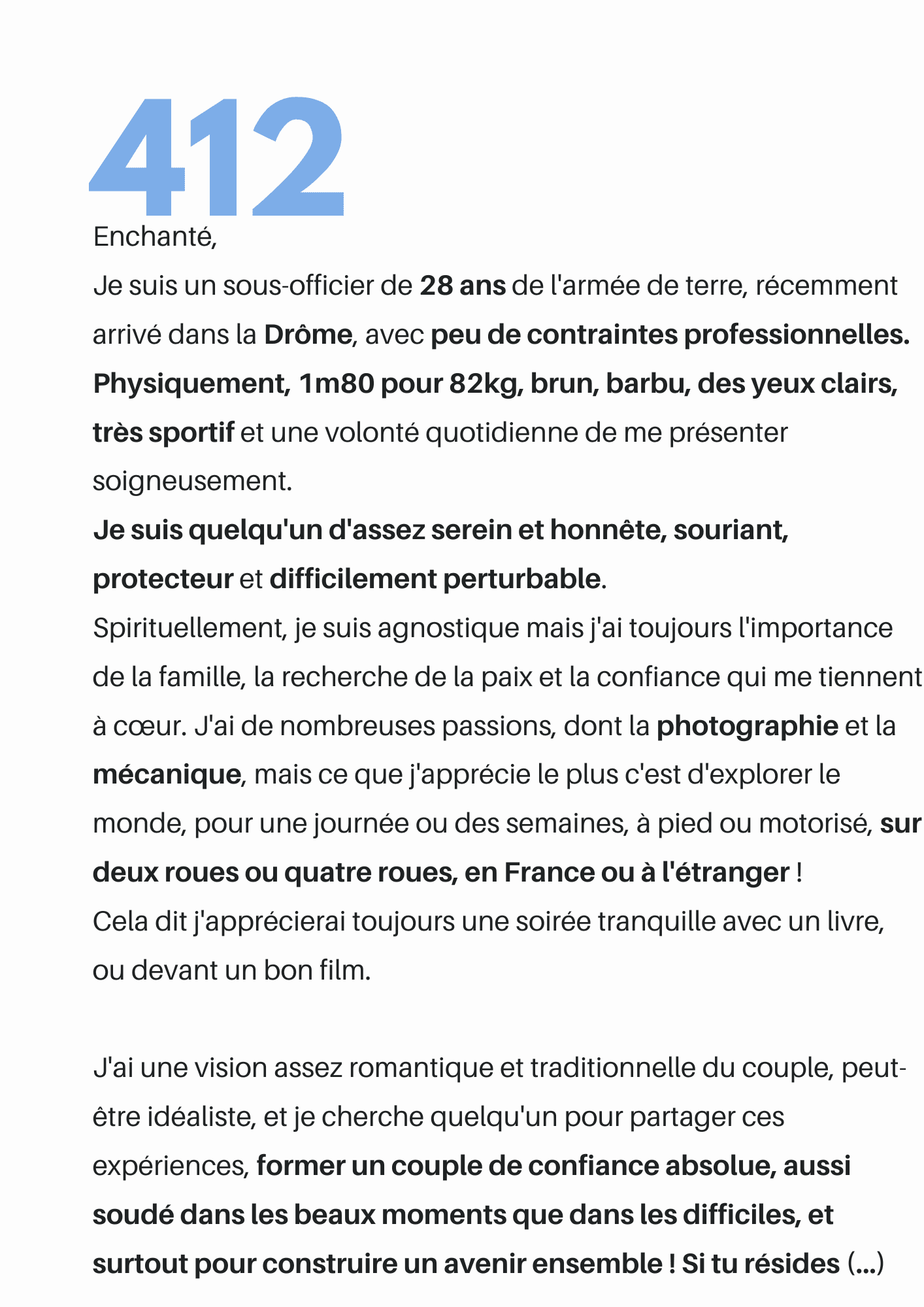 Le profil recevra directement votre présentation. Il n'y a pas de bonne ou de mauvaise façon de parler de soi. Chaque femme est différente, chaque homme l'est aussi. À vous de faire en sorte d'être celle qui choisira, sachant que le profil n'est pas obligé de vous répondre.