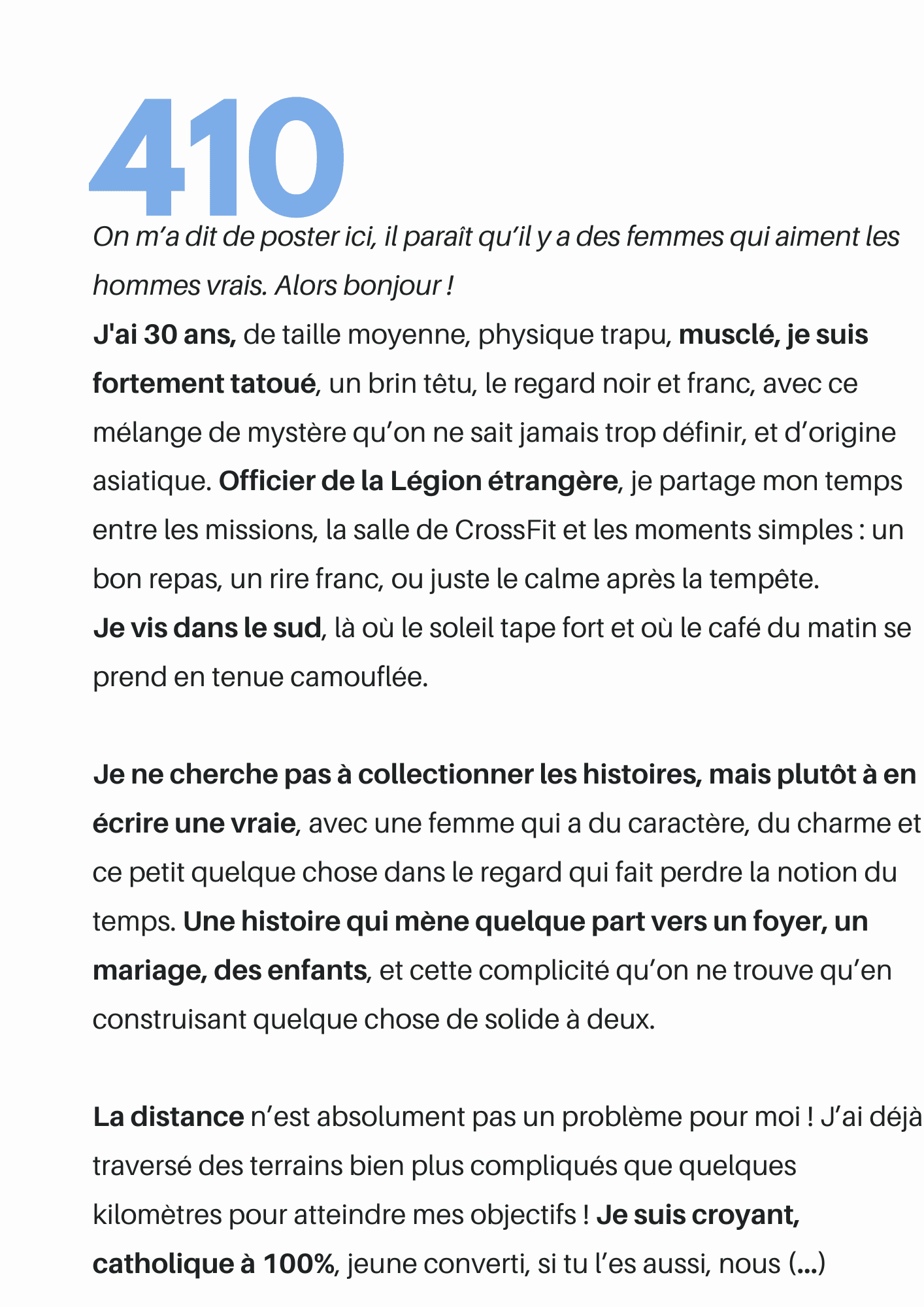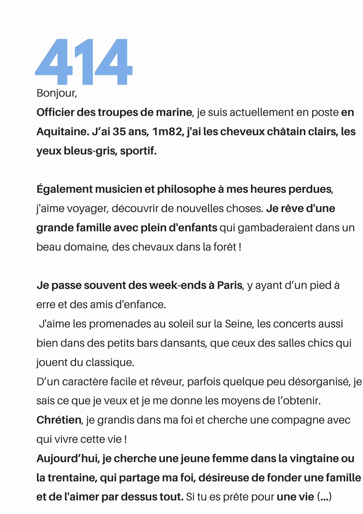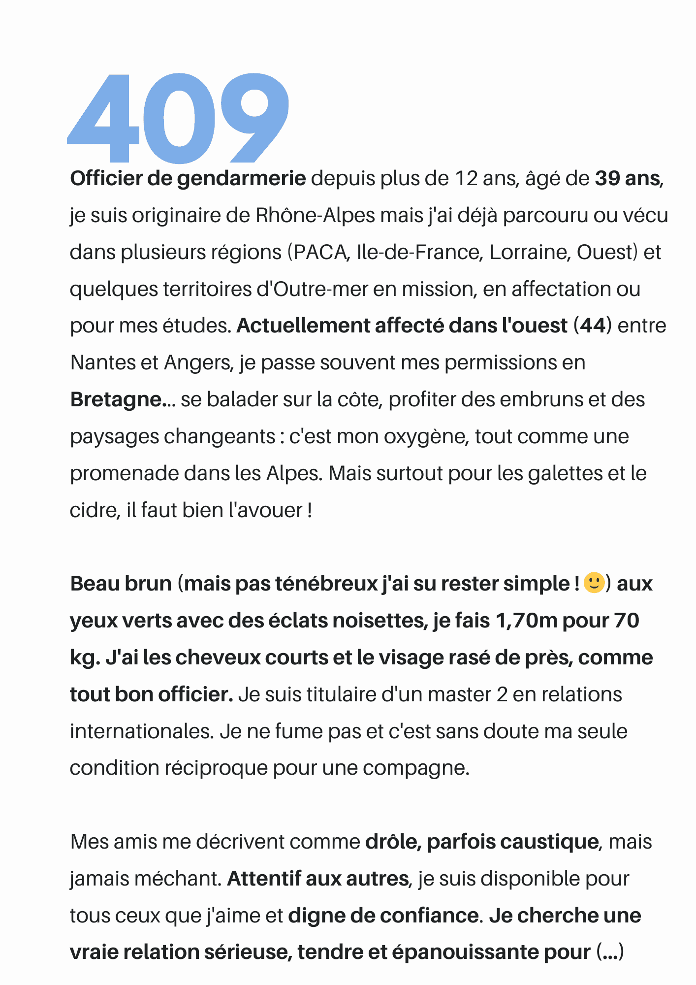Lisez les présentations écrites par les hommes validés, qui souhaitent trouver celle qui partagera leur vie.