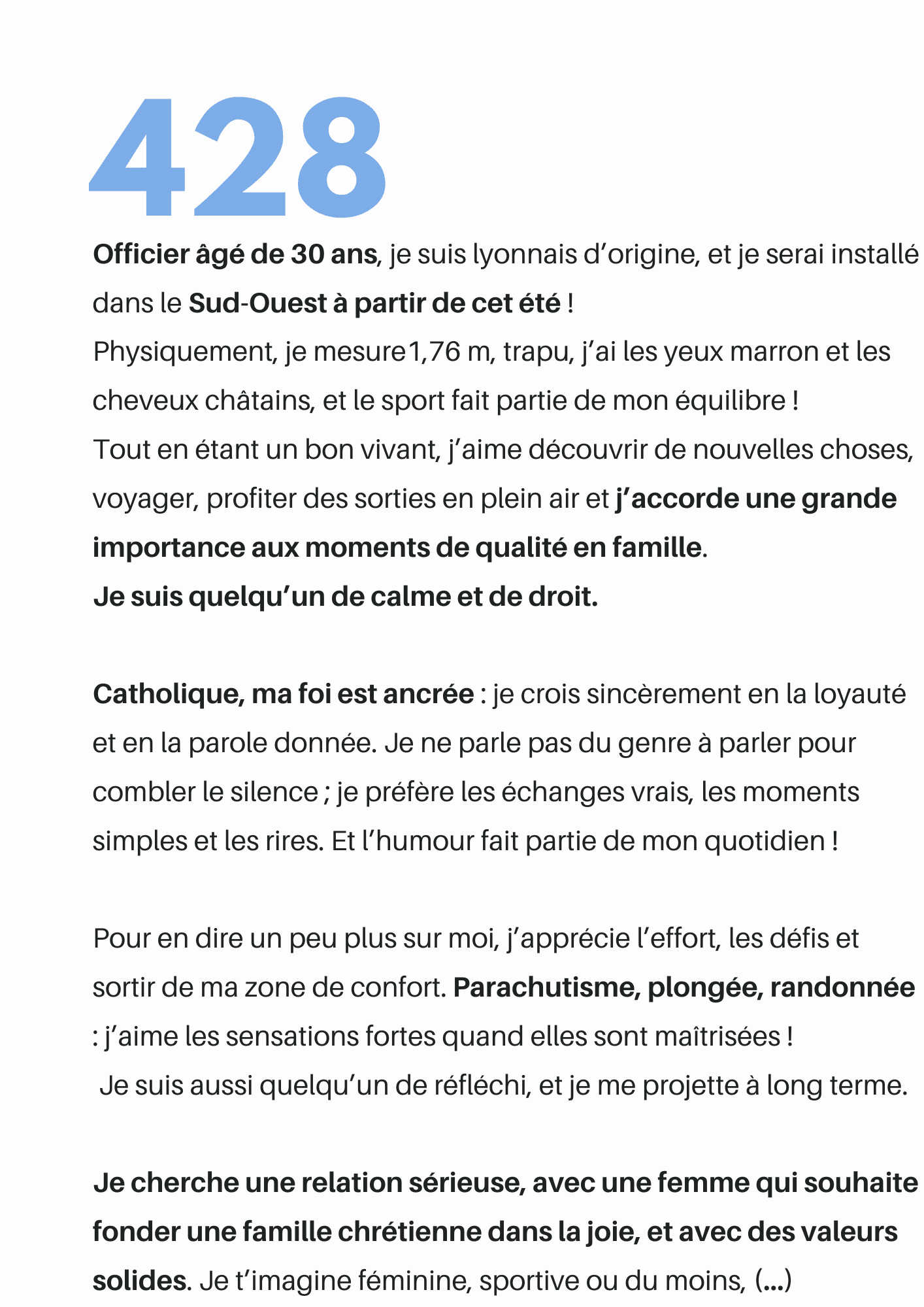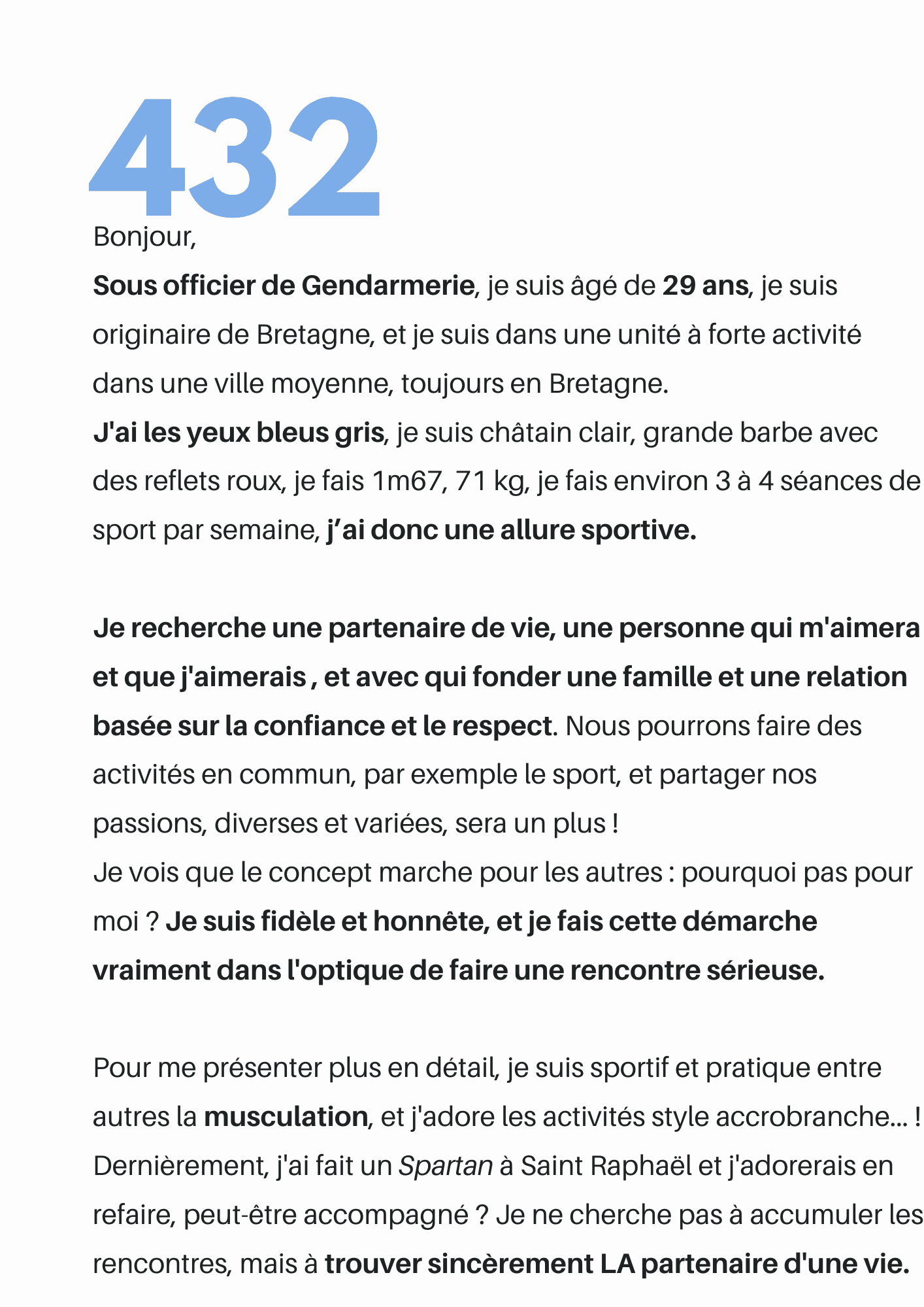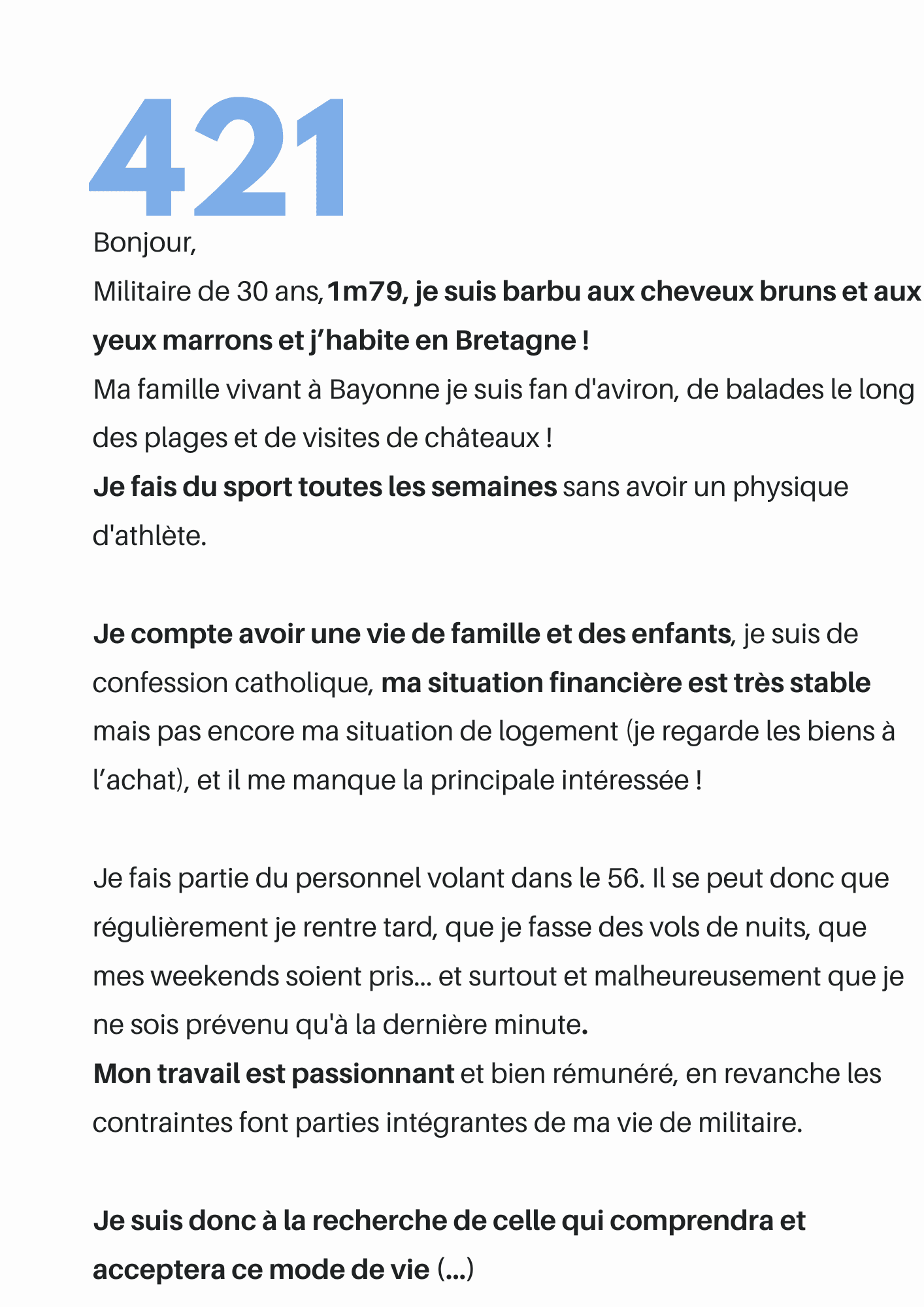 Femme de militaire depuis... des années ! Je présente des profils validés chaque semaine. Il s'agit des présentations de militaires d'active ou d'anciens militaires, réservistes, membres des forces de l’ordre, et d'hommes de valeurs en lien avec la Défense. Ils sont à la recherche d'une relation sérieuse, avec la femme de leur vie qui acceptera les contraintes professionnelles !