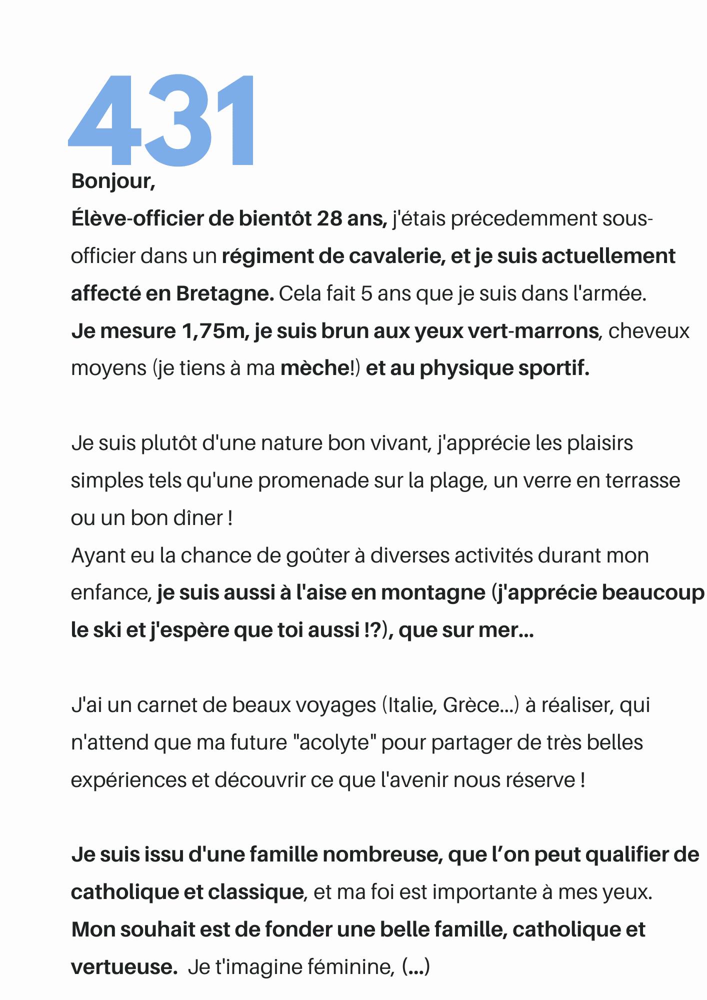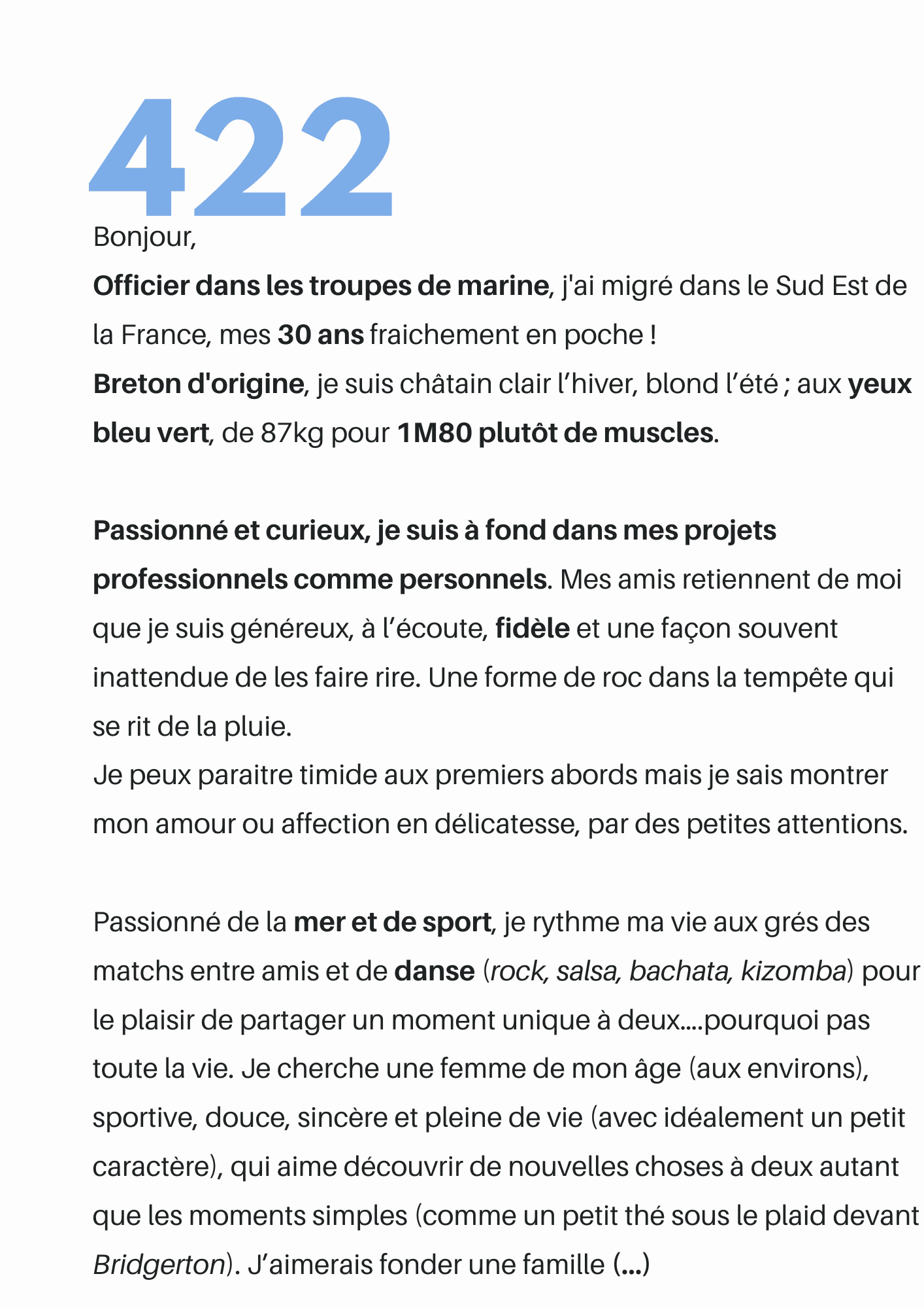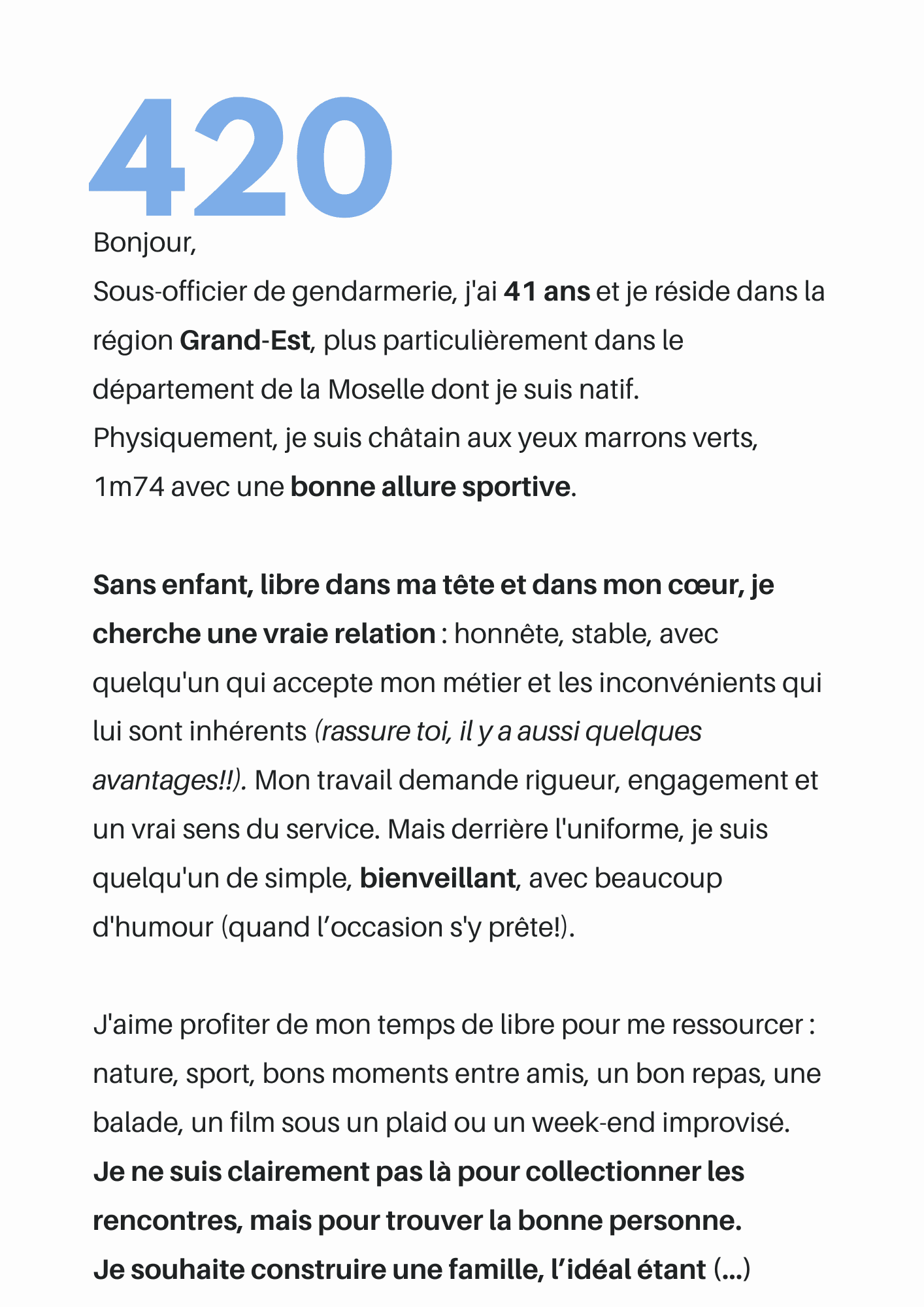 Femme de militaire depuis... des années ! Je présente des profils validés chaque semaine. Il s'agit des présentations de militaires d'active ou d'anciens militaires, réservistes, membres des forces de l’ordre, et d'hommes de valeurs en lien avec la Défense. Ils sont à la recherche d'une relation sérieuse, avec la femme de leur vie qui acceptera les contraintes professionnelles !