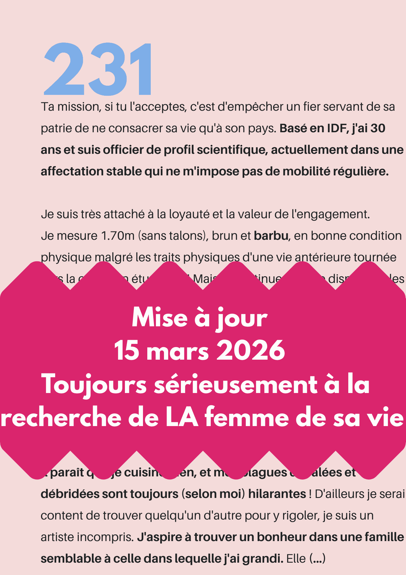 Basé en IDF, j'ai 30 ans et suis officier de profil scientifique, actuellement dans une affectation stable qui ne m'impose pas de mobilité régulière.