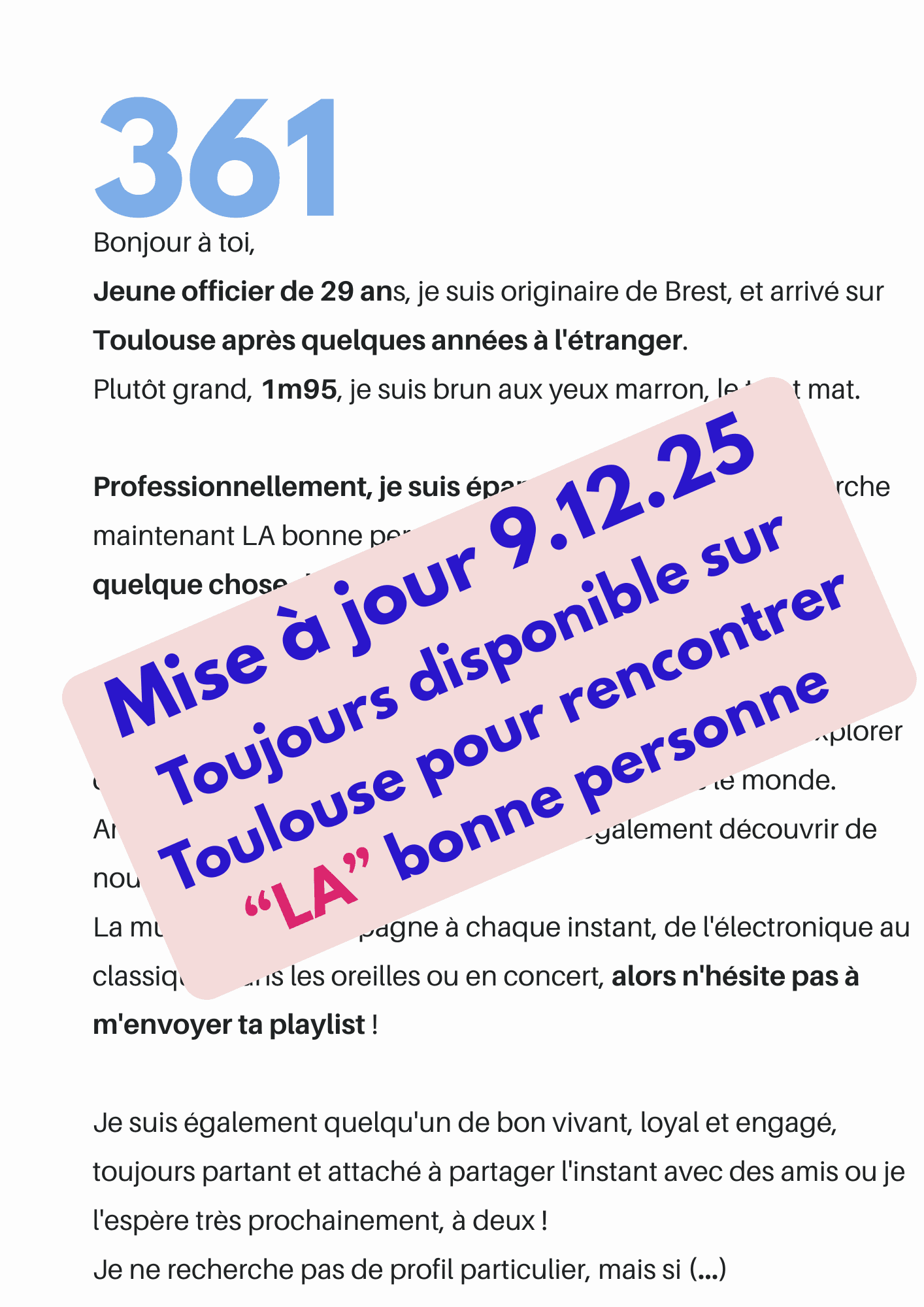 Jeune officier de 29 ans, je suis originaire de Brest, et arrivé sur Toulouse après quelques années à l'étranger.