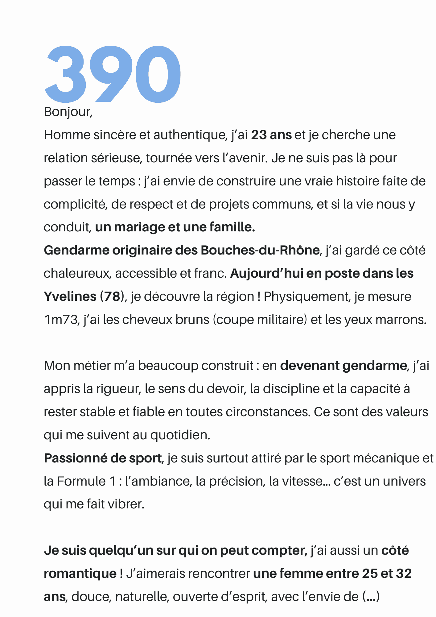 Homme sincère et authentique, j’ai 23 ans et je cherche une relation sérieuse, tournée vers l’avenir. Je ne suis pas là pour passer le temps : j’ai envie de construire une vraie histoire faite de complicité, de respect et de projets communs, et si la vie nous y conduit, un mariage et une famille.