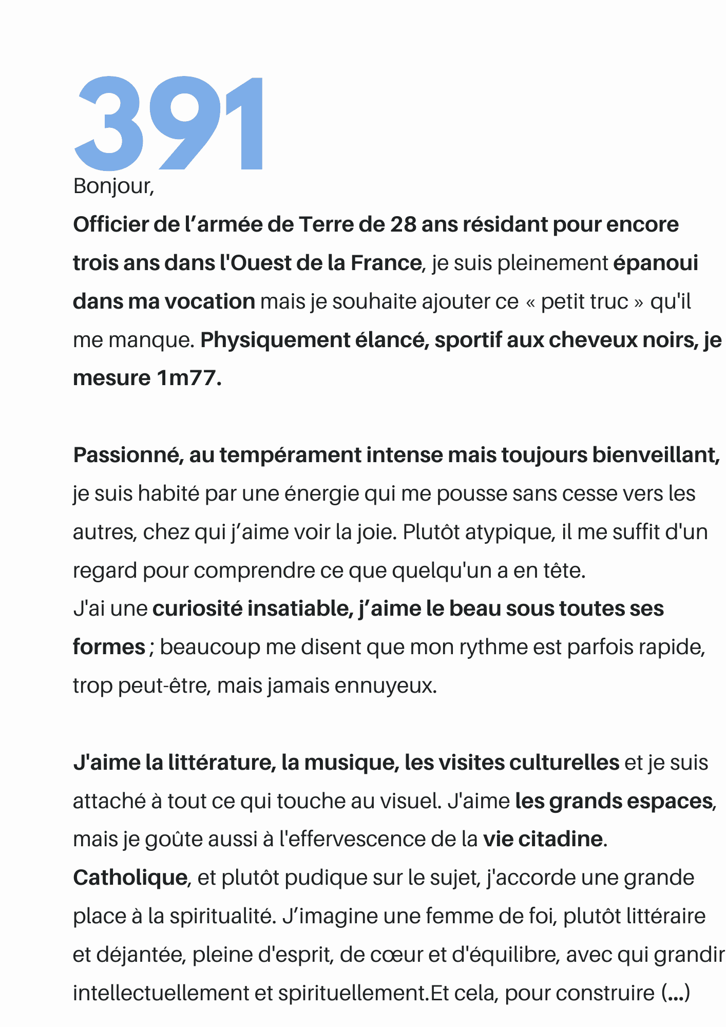 Officier de l’armée de Terre de 28 ans résidant pour encore trois ans dans l'Ouest de la France, je suis pleinement épanoui dans ma vocation mais je souhaite à présent ajouter ce « petit truc » qu'il me manque. Physiquement élancé, sportif aux cheveux noirs, je mesure 1m77.