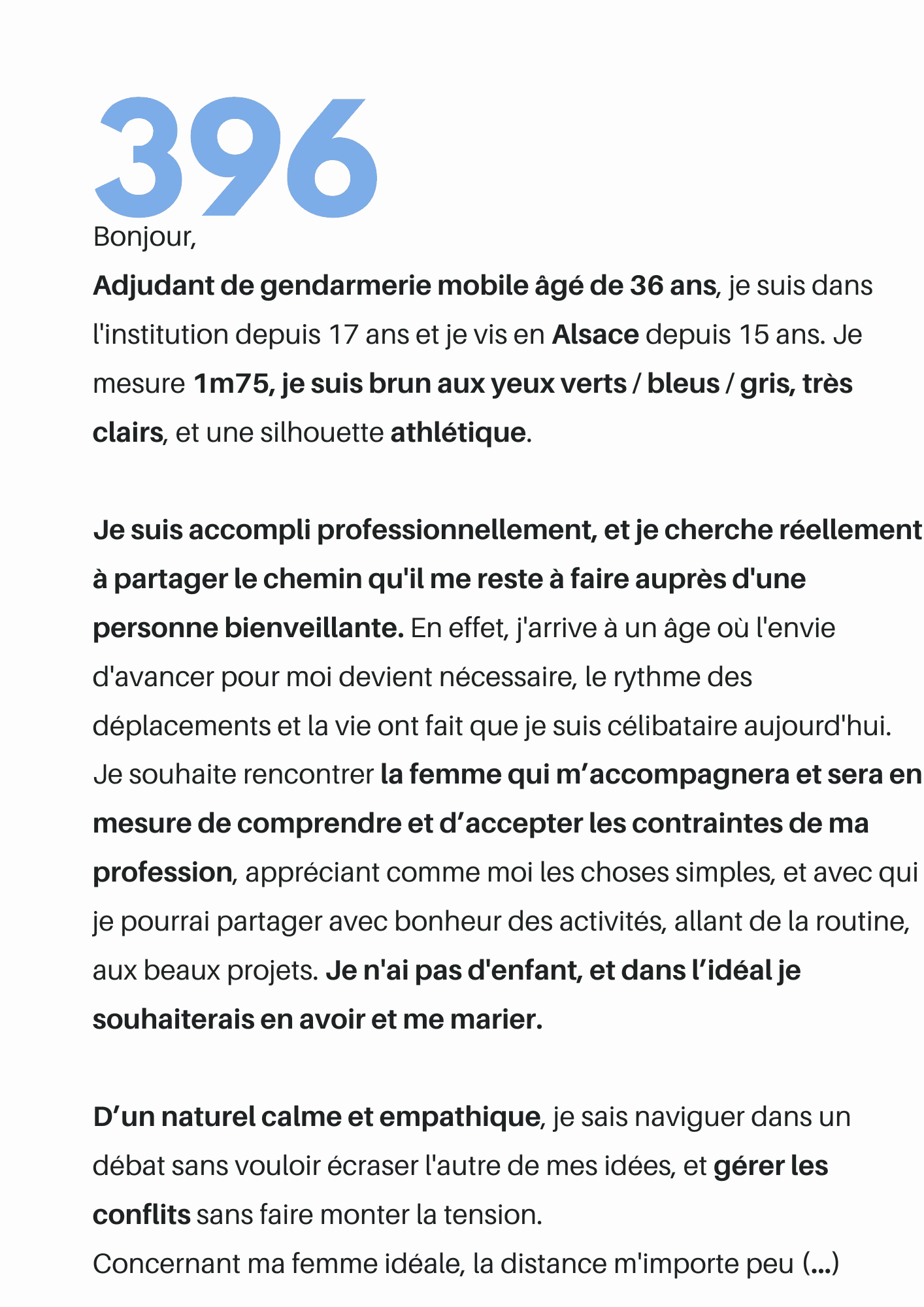Adjudant de gendarmerie mobile âgé de 36 ans, je suis dans l'institution depuis 17 ans et je vis en Alsace depuis 15 ans. Je mesure 1m75, je suis brun aux yeux verts / bleus / gris, très clairs, et une silhouette athlétique.