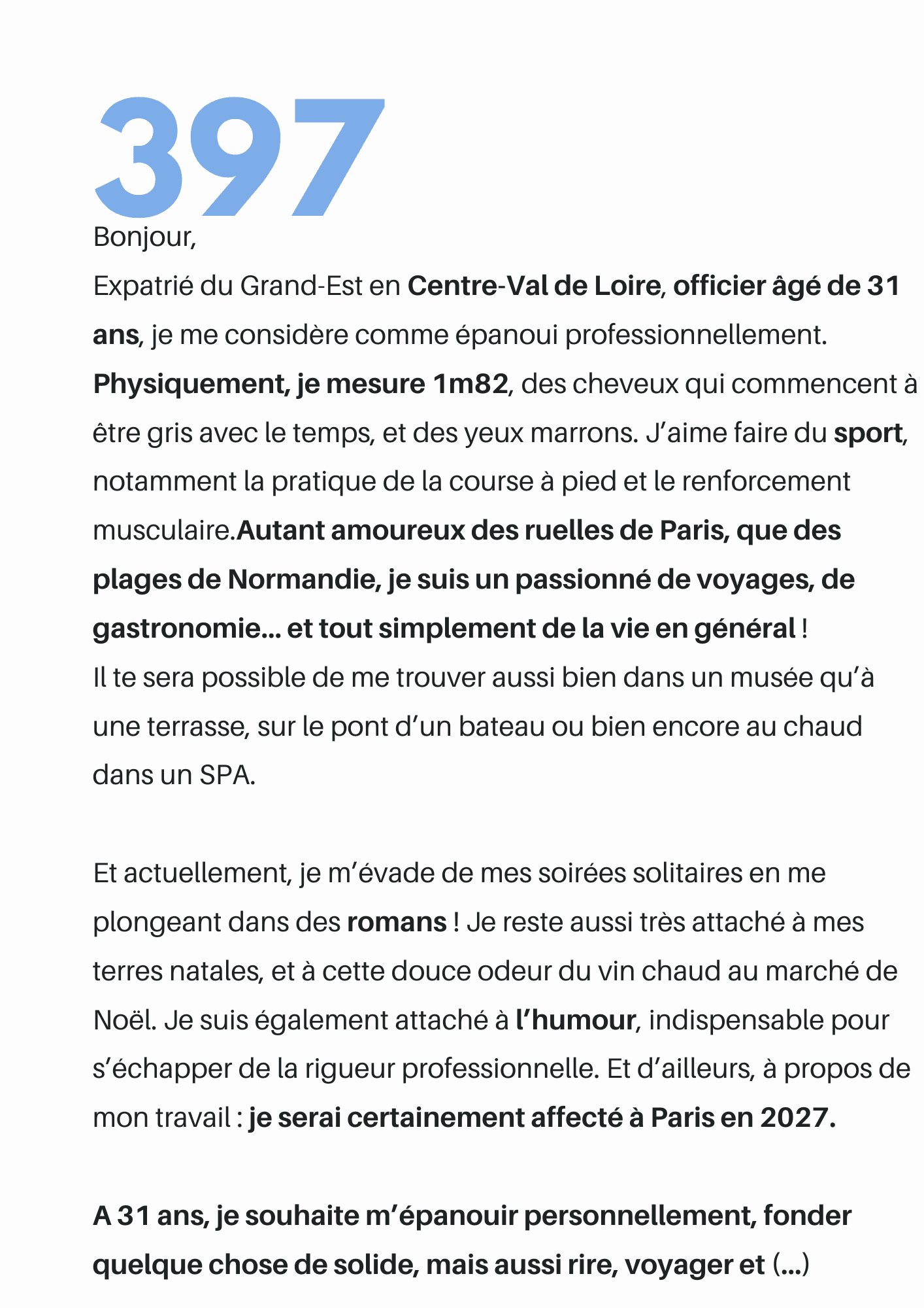 Expatrié du Grand-Est en Centre-Val de Loire, officier âgé de 31 ans, je me considère comme épanoui professionnellement.