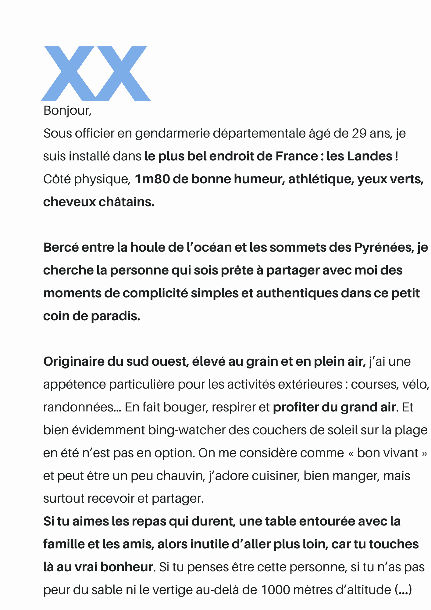 Sous officier en gendarmerie départementale âgé de 29 ans, je suis installé dans le plus bel endroit de France que sont les Landes !