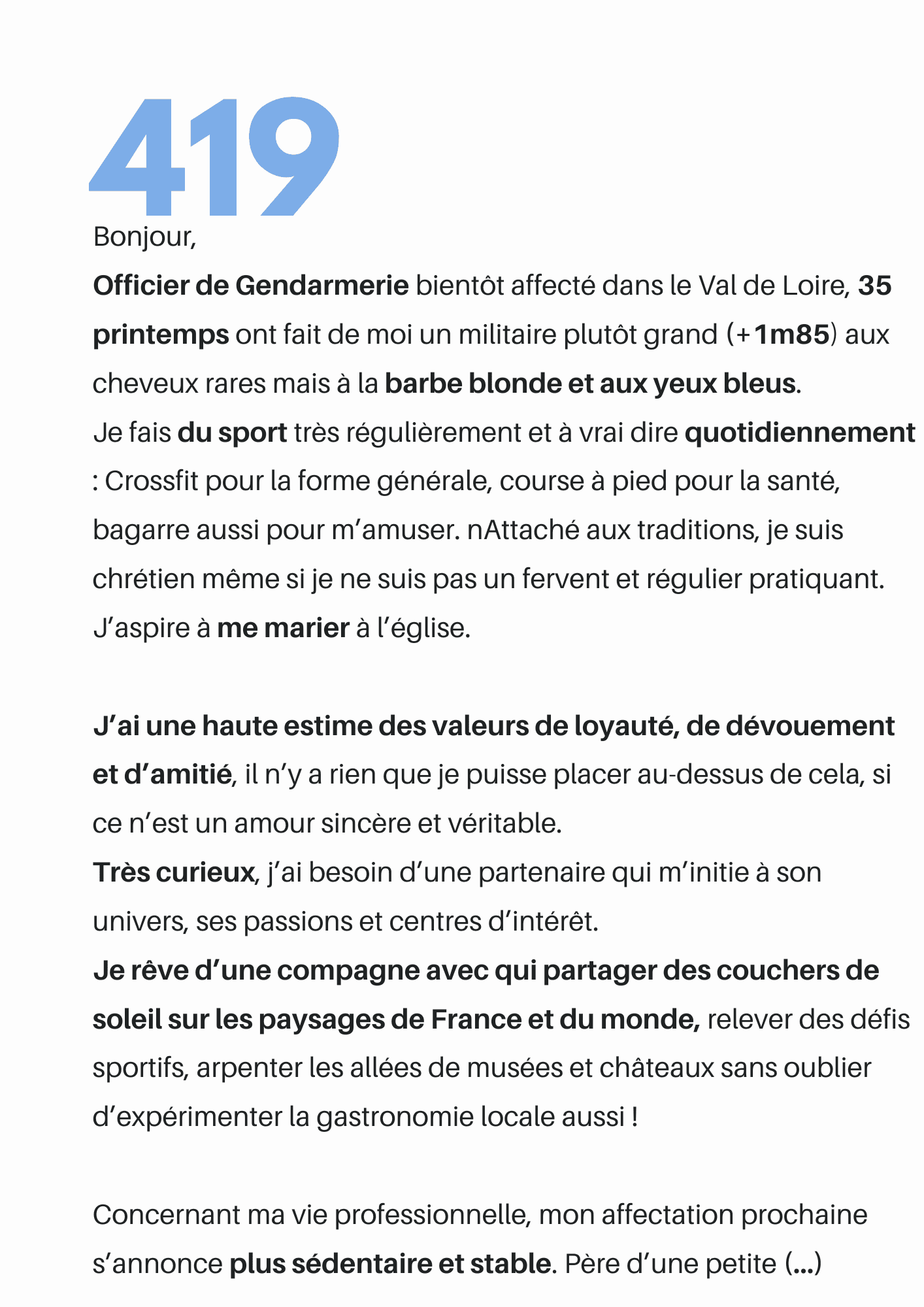 Officier de Gendarmerie bientôt affecté dans le Val de Loire, 35 printemps ont fait de moi un militaire plutôt grand (+1m85) aux cheveux rares mais à la barbe blonde et aux yeux bleus.