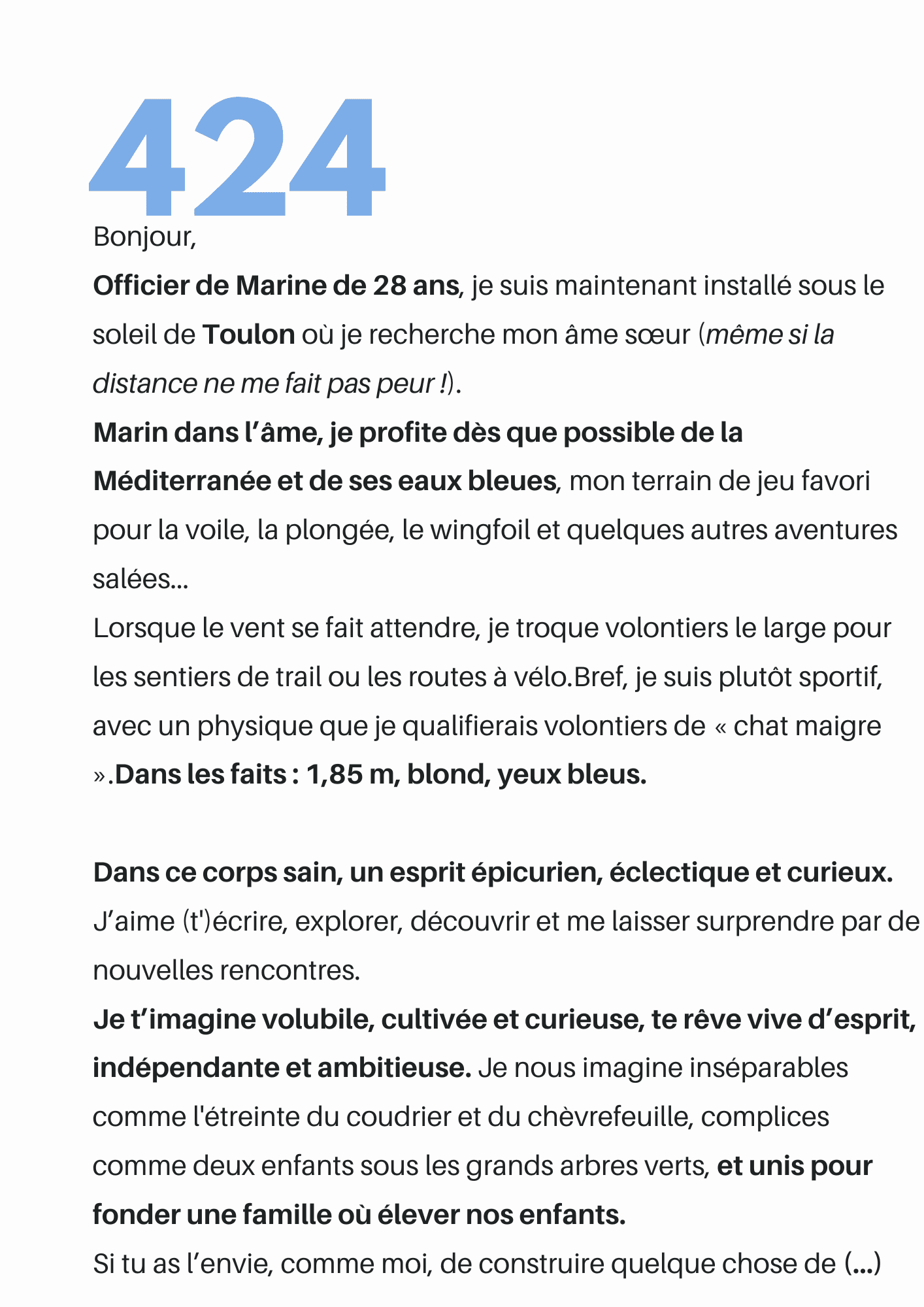 Officier de Marine de 28 ans, je suis maintenant installé sous le soleil de Toulon où je recherche mon âme sœur (même si la distance ne me fait pas peur !).
