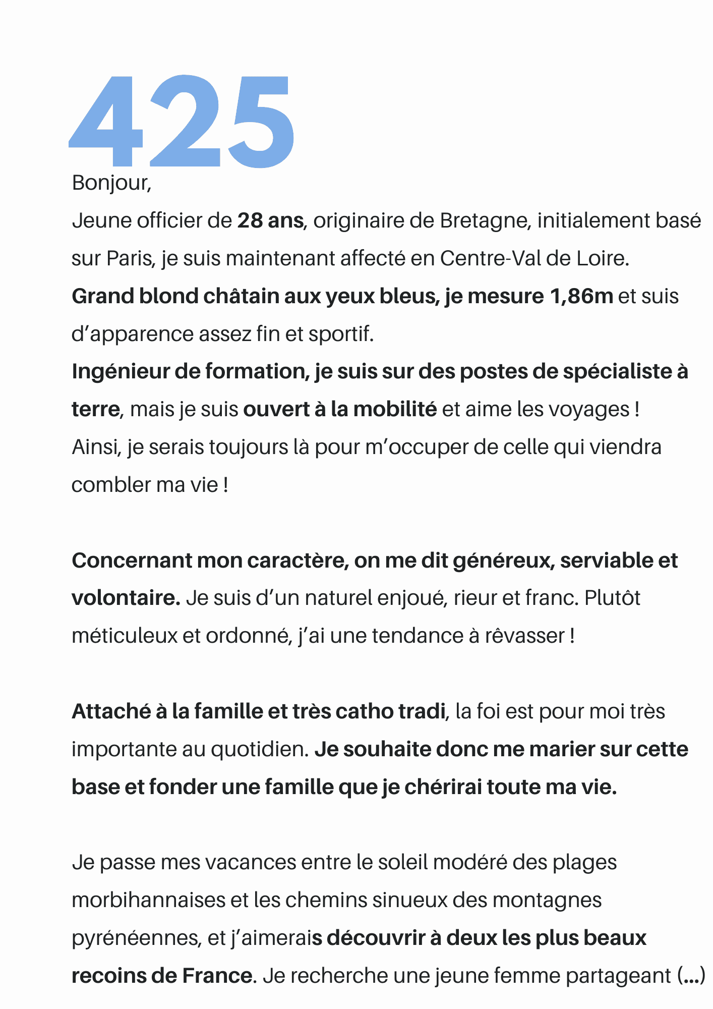 Attaché à la famille et très catho tradi, la foi est pour moi très importante au quotidien. Je souhaite donc me marier sur cette base et fonder une famille que je chérirai toute ma vie.