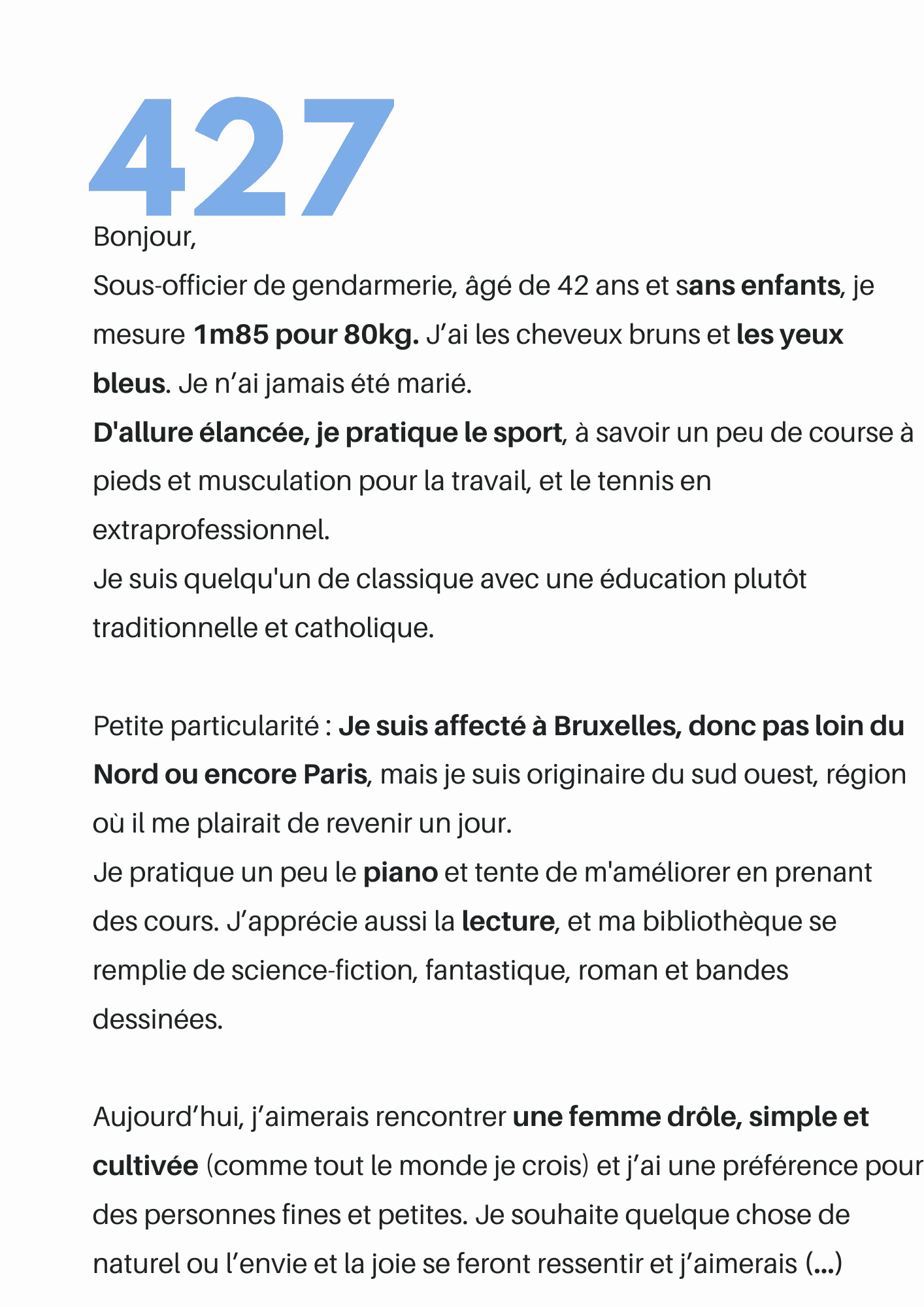 Sous-officier de gendarmerie, âgé de 42 ans et sans enfants, je mesure 1m85 pour 80kg. J’ai les cheveux bruns et les yeux bleus. Je n’ai jamais été marié.