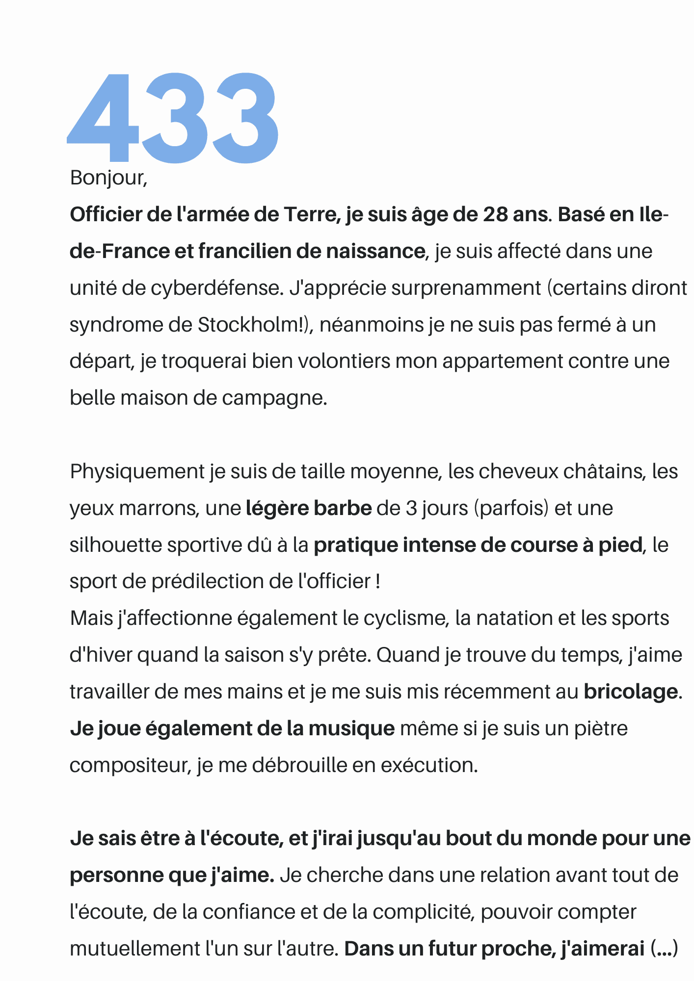 Physiquement je suis de taille moyenne, les cheveux châtains, les yeux marrons, une légère barbe de 3 jours (parfois) et une silhouette sportive dû à la pratique intense de course à pied, le sport de prédilection de l'officier ! Mais j'affectionne également le cyclisme, la natation et les sports d'hiver quand la saison s'y prête.